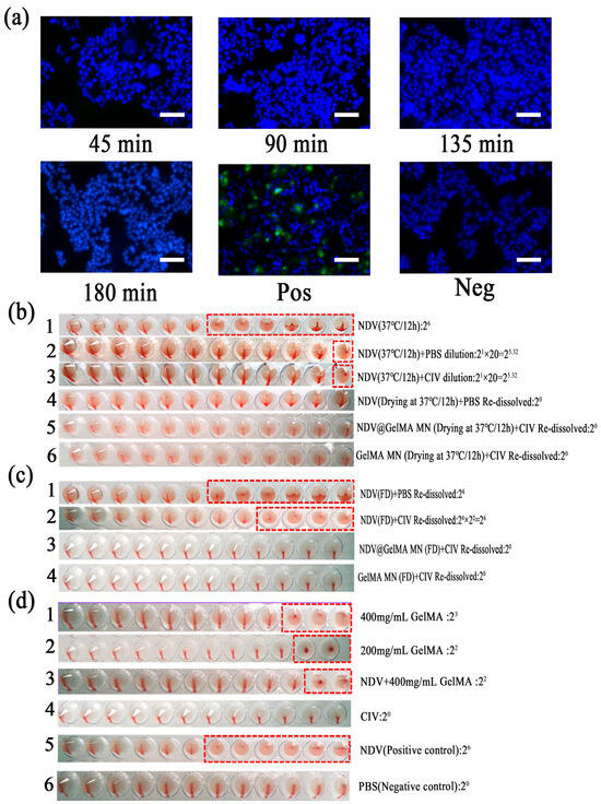 Characterization diagram of GelMA microneedles encapsulating NDV. (a) The immunofluorescence diagram of the release solution of GelMA microneedles encapsulating NDV at 45 min, 90 min, 135 min, and 180 min. (b–d) The hemagglutination diagram of different sample solutions. The hemagglutination result shown in the red box is positive.