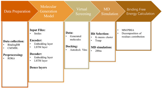 In this work, we constructed a molecular generation model based on an LSTM encoder–decoder deep learning architecture and the FBDD method to create a virtual molecular library for RET, and to perform virtual screening on this library (Figure 2). Molecules with relatively low binding energies were screened through clustering methods. Subsequently, the ADMET properties of these molecules were predicted and evaluated, and molecular dynamics simulations as well as binding free energy calculations were performed on the selected molecular systems and co-crystal complexes (RET–Pralsetinib). The results revealed that two of the generated molecules have similar interactions with the protein, compared with the co-crystal structure, and the binding energies of the generated molecules were even lower than those of the co-crystal structure. Therefore, we believe that our model can successfully identify potential selective RET inhibitors, providing new insights for the development of de novo drug design.