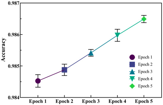 To evaluate the capacity of molecular generation by the initial model, we used accuracy (Acc) as the metric (the closer to 1, the more accurate the model) to verify the model generation capabilities. As seen in Figure 3, five epochs were conducted, and the average accuracy of each epoch was above 0.984. As the epoch continued, the model accuracy was improved. This indicates that the initial generative model possesses exceptional generative capabilities, and that the molecules it produces are highly precise and reliable.