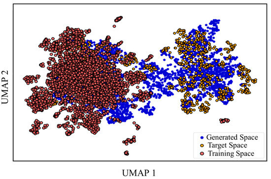 Because we wanted to build a well-performing model from limited known active compounds, we applied transfer learning. A large dataset containing about 13 million compounds (training data) was used to pre-train the initial model, and a dataset of RET active compounds (target data) was used to fine-tune it. To prove the effect of transfer learning, 10,000 random molecules from the training data, 3450 from the target data, and 6369 from the generated data were chosen to observe their chemical space similarity. The chemical space distribution of the training, target, and generated data was visualized using Uniform Manifold Approximation and Projection (UMAP) (Figure 4). The generated data molecules, post-fine-tuning, shifted from the training to the target, illustrating the effective navigational aspect of transfer learning from the training data to the target data. The result also demonstrates the ability to generalize the model, allowing for the migration of the initial model to other models with transfer learning.
