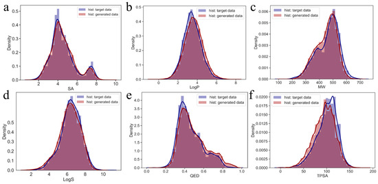 Kernel density estimation graphs for the generated and target data, represented in red and purple, respectively. (a–f) Kernel density estimation graphs for SA, LogP, MW, LogS, QED and TPSA of the generated and target data.