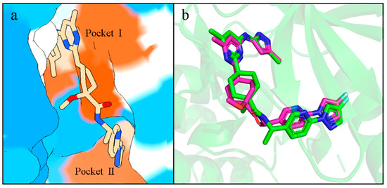 (a) Hydrophobic surface of RET with Pralsetinib, with redder colors indicating stronger hydrophobicity and bluer colors indicating stronger hydrophilicity. (b) Superimposition of the redocked conformation. The violet stick is the molecule in the crystal structure and the green stick is the re-dock molecule.