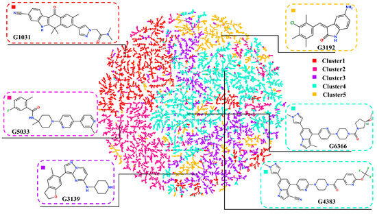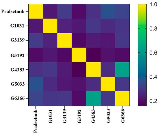 To exclude structurally similar analogs and increase the structural diversity, the remaining molecules were clustered using the K-means method after dimension reduction, forming five clusters (Figure 8). To select the most potential active molecules, one molecule with a relatively low docking binding energy was selected from each cluster for further studies. During the selection process, it was noted that the molecules in Cluster 4 generally had lower docking binding energies than those in the other clusters. Therefore, an additional molecule was selected from Cluster 4 to verify whether the molecules in Cluster 4 bind better to the RET kinase. To demonstrate the diversity of the selected molecular scaffolds, the similarity of seven molecules, including Pralsetinib, was assessed. As shown in Figure 9, apart from molecules G4383 and G6366, the similarity between the other molecules was around 0.2, and the similarity between G4383 and G6366 was around 0.6 because both molecules belonged to the same cluster. Moreover, the selected molecules are different from the scaffolds of all known RET-active compounds (Figure 6). Hence, we believe that the molecules selected from different clusters possess scaffold diversity.