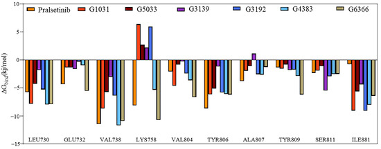 To verify our suspicions, residue binding free energy decomposition was performed. The decomposition results revealed that most residues contributed to the free energy in a trend consistent with the co-crystal structure, except for residues Lys758 and Ala807 (Figure 11). Residue Ala807 showed an unfavorable contribution in the G3139 complex system, which could be the reason for its higher binding energy in the MM/PBSA. The unfavorable contributions of residue Lys758 in the G3139, G3192, G1031, and G5033 complex systems suggested that these four systems did not form any interactions with residue Lys758 in RET. In contrast, residue Lys758 in the Pralsetinib, G4383, and G6366 complexes exhibited a strong, favorable contribution. Hence, the different energy contributions of Lys758 across the seven systems are probably due to different interactions between Lys758 and RET. Therefore, residues Ala807 and Lys758 make significant contributions to the binding free energy, which is the reason for the different free binding energies in the MM/PBSA.