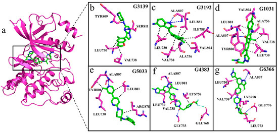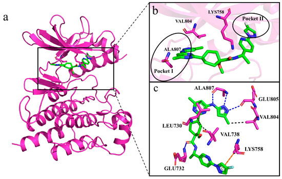 To further understand the binding mode of the molecules with the RET kinase, we first observed the interactions between Pralsetinib and RET (co-crystal structure) during the simulation, which served as a reference (Figure 12a–c) [29]. The contact surface between the receptor and protein primarily consists of Leu730, Glu732, Val738, Lys758, Val804, Glu805, and Ala807. RET forms hydrophobic interactions with Leu730 and Val738, hydrogen bonds with Glu732, Val804, Glu805, and Ala807, and a pi–cation interaction with Lys758. Pralsetinib mainly binds to Pocket I, the ATP binding site, including the hinge residues Val804, Glu805, and Ala807, to stabilize the compound in the pocket (Figure 12c). Within the complex systems, residue Ala807 is situated in the hinge region, and it forms hydrogen bonds with ATP and its competitive inhibitors to stabilize their presence in the pocket, making this residue extremely significant [30].