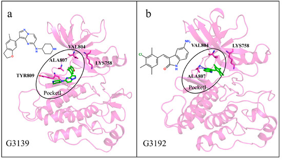 To determine whether our generated molecules exhibit selectivity for RET, we discuss each of the six generated molecules. Firstly, we analyze the generated molecules G3139 and G3192, with relatively small molecular weights, which, due to their smaller molecular weights and volumes compared to other molecules, stably reside within the ATP binding pocket and are spatially similar to many multi-kinase inhibitors. They are distanced from the gatekeeper residues Val804 and Lys758 and are not likely to be inserted into Pocket II (Figure 14a,b). Although G3192 exhibited a lower binding energy than the co-crystal molecule, it also remained confined to Pocket I due to the hydrogen bonding of the residue Typ809. Thus, these two molecules are unlikely to exhibit the selective inhibition of the RET kinase. We considered that a generated molecule must have the potential to interact with the gatekeeper residues to be considered selective.