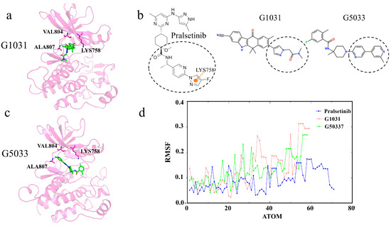 Next, we analyze the generated molecules G1031 and G5033, which, compared to G3139 and G3192, are relatively larger and form hydrogen bonds with the hinge residue Ala807. They also have lower binding energies than the Pralsetinib complex and might stably bind in the ATP pocket (Figure 15a,c). However, neither molecule interacted with residues Val804 and Lys758; instead, they inserted themselves straight into Pocket I, consistent with the decomposition results of the residue free binding energy contributions. Observing Pralsetinib’s binding mode, only by adopting a “C”-shaped conformation and enveloping residue Lys758 can a molecule avoid the gatekeeper residues and have the opportunity to enter Pocket II (Figure 12b). Therefore, we considered that the key to maintaining a “C” shape is forming interactions with residue Lys758. Due to the formation of interactions with Lys758, Pralsetinib’s tail end is less flexible than the other two molecules, facilitating the maintenance of the “C” shape (Figure 15b,d). Hence, the generated molecules G1031 and G5033 also lack selectivity.