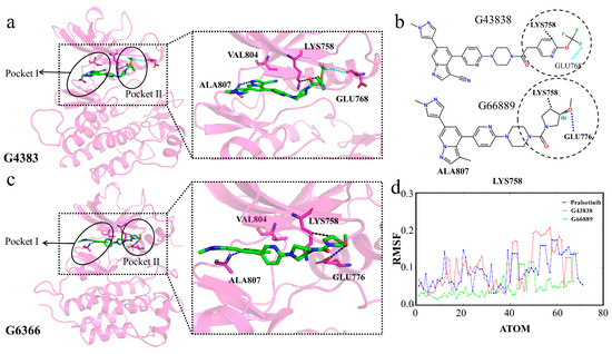 Finally, we analyze the two molecules G4383 and G6366 from the same cluster. The results show that both molecules form hydrophobic interactions with residue Lys758 (Figure 16a–c). The formation of these interactions causes the molecules’ tails to bend similarly to Pralsetinib, allowing the tails to enter into Pocket II. Although G4383 and G6366 did not interact with the gatekeeper residue Val804, they still circumvented the gatekeeper residues Val804 and Lys758 of Pocket II by wrapping around Lys758 and entering the second active pocket. Throughout the simulation, the flexibility of the tails of G4383 and G6366 was similar to Pralsetinib, indicating that, during the simulation, the tails of the two molecules were fixed by residue Lys758, also adopting a “C” conformation to enter into Pocket II (Figure 16a,c,d). This conformation aligns with the Pralsetinib–RET complex. This interaction analysis is consistent with the MM/PBSA, and residue Lys758 is significant in the selectivity of the molecule. Therefore, we suggest that the generated molecules G4383 and G6366 exhibit selectivity.