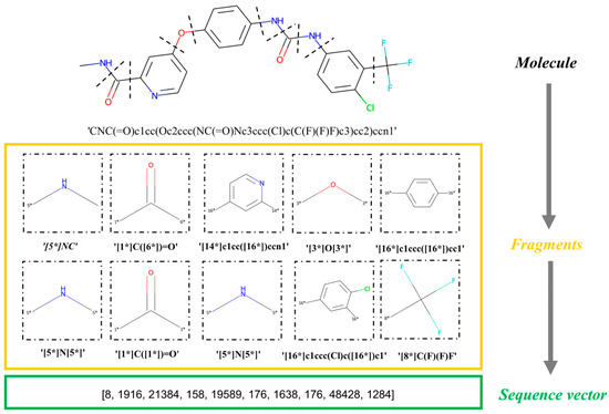 First, our model entails breaking the dataset into a sequence of fragments. Using the Breaking of Retrosynthetically Interesting Chemical Substructures (BRICS) algorithm in RDKit, a molecule is split into several fragments based on whether or not it can be synthesized [10], and each fragment is transformed into a standardized SMILES format, generating a set of fragment sequences. Briefly, the BRICS rules mean that molecular components with important functions and structures are retained. This algorithm scans the sequences of the SMILES ordered from left to right, extracting a fragment if a breakable bond is found. “Dummy” atoms are marked at the position of the cleavage sites. Our model uses molecular fragments as the basic units of input instead of strings [31]. The sequence of the fragments is viewed as a “sentence” and each fragment is viewed as a “word”. Each molecule in the dataset is converted into a fragment sequence representation, and after one-hot encoding, word-embedding processing, and batch processing, is input into our model. Note that the process of fragment extraction is in the left-to-right order according to the sequence of the SMILES. This process is fully reversible. In Figure 17, we display an example to illustrate the fragmentation and conversion into sequence vectors with our algorithm [32].