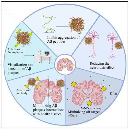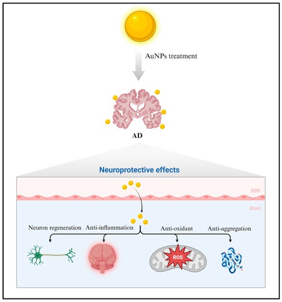 AuNPs are being explored as a potential therapeutic strategy in the treatment of AD due to their unique properties [,,]. Some ways in which AuNPs could be used are discussed in this section. Neuroprotection: AuNPs can have neuroprotective effects by reducing inflammation and promoting the survival of neurons. This could help preserve cognitive function and slow down disease progression. Promotion of neurogenesis: in some research, AuNPs have been shown to promote neurogenesis, which could aid in regenerating damaged neurons. Modulation of immune responses: AuNPs can modulate immune responses, potentially reducing neuroinflammation, a common AD feature. Antioxidant effects: Some AuNPs exhibit antioxidant properties, which can help mitigate oxidative stress. Oxidative stress plays a role in the progression of AD, contributing to neuronal damage. Anti-aggregation: AuNPs might interfere with the aggregation of Aβ proteins, preventing the formation of toxic plaques that contribute to neuronal damage and cognitive decline. Drug delivery: AuNPs can be functionalized to carry drugs across the BBB and target specific regions in the brain that are affected by AD. They could deliver drugs that inhibit the formation of Aβ plaques or tau tangles, the pathological hallmarks of the disease. Metal chelation: AuNPs might act as metal chelators, binding to metals like copper and zinc that are involved in amyloid aggregation. This could disrupt the formation of amyloid plaques. Overall, AuNPs have demonstrated potential in AD research due to their anti-inflammatory and neuroprotective properties (Figure 2). Several studies have investigated the therapeutic effectiveness of AuNPs in neurodegenerative conditions such as AD. This neuroprotective effect is crucial for impeding disease progression and preserving cognitive function. AuNPs possess anti-inflammatory properties that have the potential to alleviate nerve inflammation. By regulating the inflammatory response, AuNPs could aid in safeguarding brain cells and enhancing overall brain function in individuals with AD.