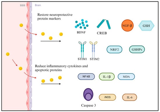 Another factor is the surface modification of AuNPs using polyethylene glycol (PEG) coating. PEGylation can improve the stability and biocompatibility of AuNPs []. PEG-coated AuNPs can have prolonged circulation times in the bloodstream. Biomaterial coating: Coating AuNPs with biomaterials such as proteins or peptides can increase their specificity for specific cell types or tissues []. This can reduce potential immune responses and improve their biocompatibility. Targeted ligands: functionalizing the surface of AuNPs with ligands that target specific receptors on neuronal cells can increase their specificity and efficacy in neuroprotection [,]. The most important mechanisms are the neuroprotective mechanisms of AuNPs, anti-inflammatory effects. AuNPs may modulate inflammatory responses, potentially reducing neuroinflammation [,]. Antioxidant properties: AuNPs may have inherent antioxidant properties, which may be beneficial in protecting neurons from oxidative stress [,]. Drug delivery: surface modifications may enable AuNPs to carry and deliver neuroprotective drugs to specific sites in the brain []. Photothermal therapy: small-sized AuNPs with specific surface modifications can be used for photothermal therapy, where light generates localized heat for therapeutic purposes []. It is important to note that while AuNPs hold promise for neuroprotection, thorough in vitro and in vivo studies, considering various parameters, are needed to understand their safety and efficacy in specific applications. The field of nanomedicine is rapidly evolving, and ongoing research continues to shed light on the intricate interactions between nanoparticles and biological systems.