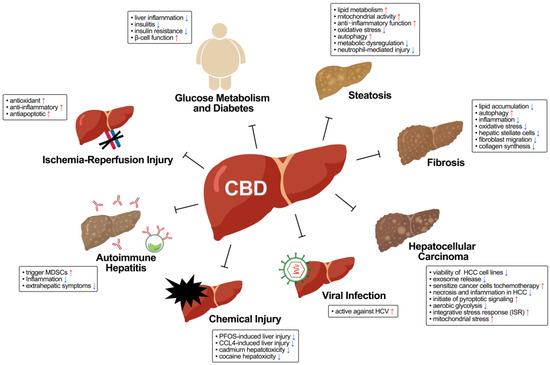 Overview of protective actions of CBD against liver diseases. The physiological effects of CBD in liver disease are depicted in the boxes. Red arrows represent increase, and blue arrows represent decrease.