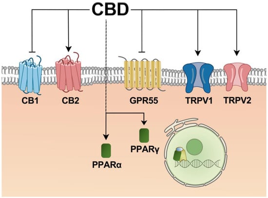 Schematic representation of potential receptor of CBD in the liver. Abbreviations: CBD, cannabidiol; CB1, cannabinoid receptor 1; CB2, cannabinoid receptor 2; GPR55, G protein-coupled receptor 55; TRPV1, transient receptor potential vanilloid channel 1; TRPV2, short receptor possible vanilloid channel 2; PPARα, peroxisome proliferator-activated receptor α; PPAR γ, peroxisome proliferator-activated receptor γ.