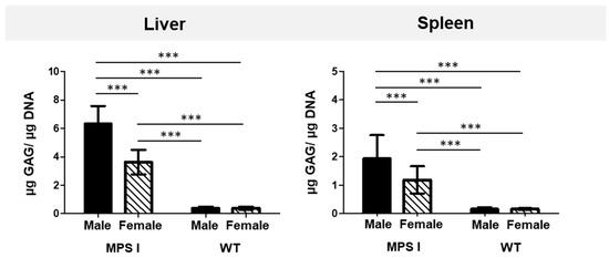 GAG levels in the liver and spleen of 20-week-old MPS I and wild-type (WT) mice of both sexes. Tissue GAG levels were normalized to the amount of DNA. The results are presented as mean ± standard deviation. N = 18 animals per group. Significance: *** p < 0.001 between sexes and phenotypes (Student’s t-test).