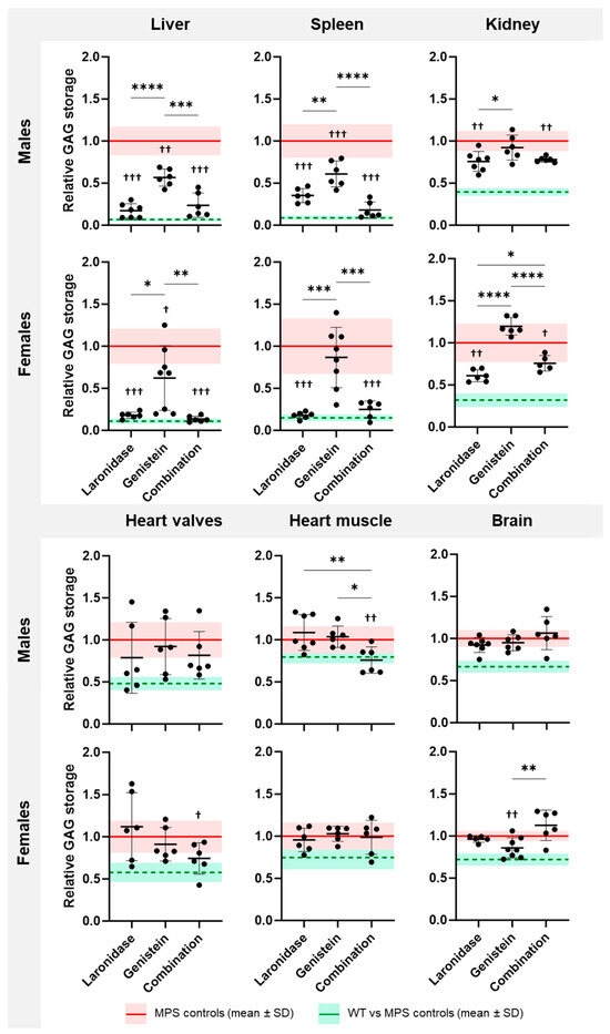 GAG storage in the organs of 20-week-old MPS I mice after treatment with laronidase, genistein, or their combination. GAG levels were determined in the liver, spleen, kidneys, heart valves, heart muscle, and brain obtained from animals of both sexes receiving 100 U/kg/week laronidase, 160 mg/kg/day genistein, or a combination of both for 12 weeks and were normalized to those of untreated MPS I mice. The graphs represent the results obtained for individual animals and show the mean ± standard deviation (SD). GAG storage in untreated MPS I mice is presented as a red horizontal line ± SD. GAG storage in wild-type (WT) animals is presented relative to that in untreated MPS I animals (green horizontal line ± SD). N = 6 animals per group. Significance: * p < 0.05, ** p < 0.01, *** p < 0.001, or **** p < 0.001 between treatments (Tukey’s post hoc test after ANOVA or Dunn’s post hoc test after Kruskal–Wallis test); † p < 0.05, †† p < 0.01, or ††† p < 0.001 between treated and untreated MPS I mice (Student’s t-test).