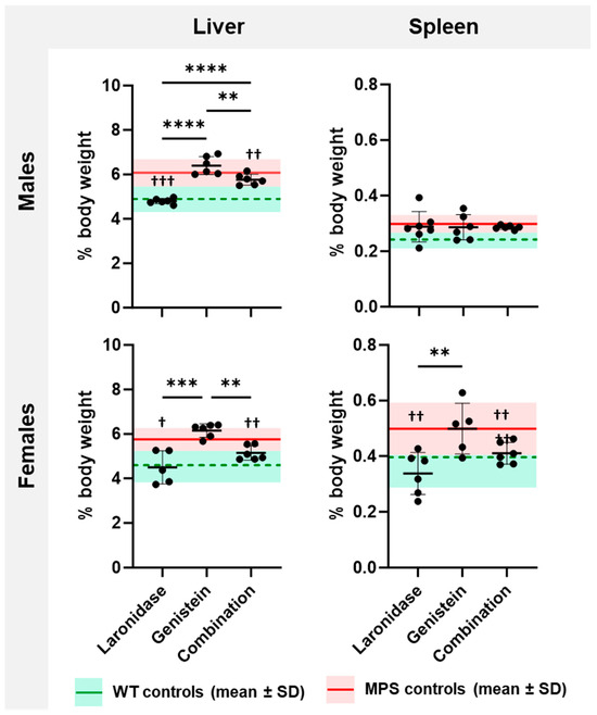 Liver and spleen weights of 20-week-old MPS I mice after treatment with laronidase, genistein, and combination therapy. Organ weights were measured following a 12-week administration of 100 U/kg/week laronidase, 160 mg/kg/day genistein, or combination therapy, and were normalized to body weight (% body weight). The graphs present the results obtained for individual animals and mean ± standard deviation (SD). The means of untreated MPS I and wild-type (WT) control animals are depicted as red solid and green dashed horizontal lines, respectively. N = 6 animals per group. Significance: ** p < 0.01, *** p < 0.001, or **** p <0.0001 between treatments (Tukey’s post-hoc test after ANOVA); † p < 0.05, †† p < 0.01, or ††† p < 0.001 between treated and untreated MPS I mice (Student’s t-test).