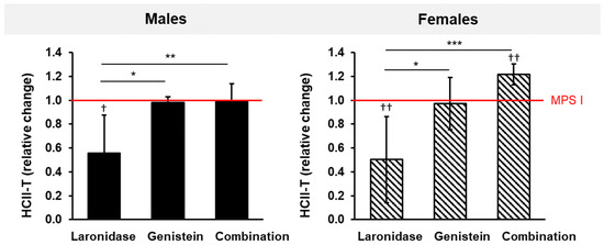 Relative changes in the HCII-T levels in the sera of MPS I mice of both sexes after treatment with laronidase, genistein, or combination therapy. HCII-T levels were measured in the sera obtained from mice after 12 weeks of treatment with 100 U/kg of laronidase, 160 mg/kg of genistein, or a combination of both, and were normalized to age-matched untreated MPS I animals (red horizontal, solid line). The results are presented as the mean ± standard deviation. N = 6 animals per group. Significance: * p < 0.05, ** p < 0.01, or *** p < 0.01, between treatments (Tukey’s post-hoc test after ANOVA or Dunn’s post-hoc test after Kruskal–Wallis test); † p < 0.05, †† p < 0.01, between treated and untreated MPS I mice (Student’s t-test).