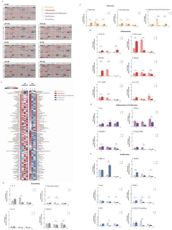 Cytokine array analysis under AP or NP in the early timeline of wound healing. (A) Comparison of cytokine expression at 0, 0.5, 2, and 16 h between the AP and NP groups using the cytokine array. The “yellow frames” indicate hemostasis cytokines. The “red frames” indicate inflammatory cytokines. The “purple frames” indicate inflammation and proliferation cytokines. The “blue frames” indicate proliferation cytokines. The “gray frames” indicate remodeling cytokines. (B) The heatmap displays standardized expression fold changes, reflecting the extent of these changes in atmospheric (AP) or negative (NP) pressure settings at specific time points compared to the control experiments (0 h). Z−scores for each gene were calculated based on its fold change data from both pressure settings, and genes within the same functional group were sorted based on their Z−scores at the 0.5 h mark in NP. (C) Inflammation-related, (D) inflammation and proliferation, (E) proliferation, (F) and remodeling (G) cytokine expression. Statistical significance: * p < 0.05, ** p < 0.01, *** p < 0.001 Student’s t-test); data shown as mean ± SD.