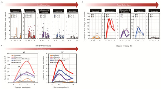 Due to the experimental design, significant changes related to hemostasis and inflammation can be observed in the early stages of NP wound healing. However, it is challenging to observe comprehensive changes in cytokines associated with proliferation (Figure 1E–G). Interestingly, after achieving hemostasis, the epithelium normalizes the interstitial context by removing fibroblasts stimulated during matrix reconstruction while wound healing is completed. However, Growth-differentiation-factor-15 (GDF-15) acts as a regulator, preventing excessive proliferation and activation of fibroblasts, and induces epidermal changes at 2 h as revealed in our analysis of post-full-thickness skin wounding in the NP groups (Figure 1A,F) during the inflammation stage [18]. This phenomenon did not occur in the AP group.