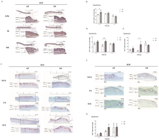 To gain further insights into early wound healing quality, we assessed hair follicle regeneration and re-epithelialization through IHC staining. Specifically, we performed immunohistochemical staining for K15 expression at various time points (0.5, 2, and 16 h) under both AP and NP conditions.