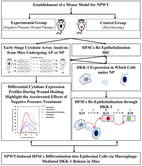 In investigating NPWT, we established a murine model using a stepped 125 mmHg NP regimen. This study aimed to understand the cytokine, chemokine, and growth hormone profiles during the hemostasis, inflammation, proliferation, and remodeling phases, providing insights into NPWT’s early-stage mechanisms. Our results revealed that NPWT-induced macrophages secrete DKK-1, promoting HFSC differentiation into epidermal cells and accelerating early wound healing. This study offers valuable insights for targeted therapeutic strategies to optimize NPWT efficacy and improve patient outcomes.