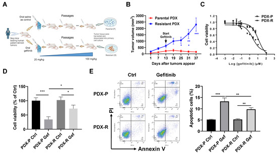 Induction of the acquired gefitinib-resistant PDX model in vivo. (A) A schematic figure illustrating the process of inducing the acquired gefitinib-resistant PDX model in vivo. (B) The mice bearing passage-matched parental or resistant PDX tumors were orally administrated with 100 mg/kg gefitinib twice per week for 4 weeks. The tumor volume was measured every 6 days. The growth curve of each group was plotted. (C–E) The PDX tumors were digested with a collagenase cocktail to obtain primary cells in single-cell suspension. (C) The primary cells dissociated from parental or resistant PDX tumors were plated in 96-well plates at 3000 cells/well and then treated with different concentrations of gefitinib for 72 h. The cell viability of each well was measured using an MTT assay, and the IC50 of gefitinib was then calculated based on the MTT results. (D) Cells were plated in 6-well plates and treated with DMSO or 5 µmol/L gefitinib for 72 h. Cell viability was evaluated by counting the cell number. (E) Cells were treated with DMSO or 5 µmol/L gefitinib for 72 h. The apoptotic rate of the cells was measured using the Annexin V/PI double-staining flow cytometer. * p < 0.05; ** p < 0.01; *** p < 0.001.