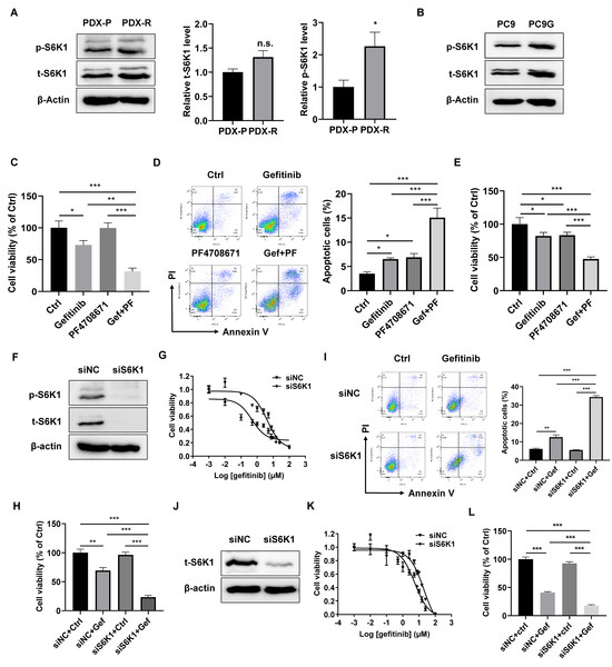 S6K1 contributes to the acquired resistance of lung cancer cells to gefitinib. (A) Protein expression of total and phosphorylated S6K1 was measured in the PDX-P and PDX-R cells using immunoblotting. The intensity of the bands was quantified. (B) Protein expression of total and phosphorylated S6K1 was measured in PC9G cells using immunoblotting. (C,D) The PDX-R primary cells in 6-well plates were exposed to DMSO, 5 µmol/L gefitinib, 5 µmol/L PF-4708671, or gefitinib plus PF-4708671 for 72 h. (C) Cell viability was evaluated by counting the cell number per well. (D) Cell apoptosis was measured using the Annexin V/PI double-staining flow cytometer. (E) PC9G cells were treated with DMSO, 5 µmol/L gefitinib, 5 µmol/L PF-4708671, or gefitinib plus PF-4708671 for 72 h. Cell viability was evaluated by counting the cell number. (F–I) PDX-R cells were transfected with 100 nmole/L S6K1-specific siRNA to silence S6K1. Cells transfected with 100 nmole/L scramble siRNA (siNC) were used as controls. (F) The immunoblot shows the depletion of S6K1 in the PDX-R cells. (G) The 72 h IC50 of gefitinib in the control and S6K1-depleted PDX-R cells was evaluated using the MTT assay. (H) The cells were exposed to DMSO or 5 µmol/L gefitinib for 72 h. Cell viability was measured by counting the cell number. (I) Cell apoptosis was measured using flow cytometry, as described above. (J–L) PC9G cells were transfected with 100 nmole/L S6K1-specific siRNA or scramble siRNA. (J) Depletion of S6K1 was validated using immunoblotting. (K) The 72 h IC50 of gefitinib in the control and S6K1-depleted cells was evaluated using the MTT assay. (L) The cells were exposed to DMSO or 5 µmol/L gefitinib for 72 h. Cell viability was measured by counting the cell number. * p < 0.05; ** p < 0.01; *** p < 0.001.