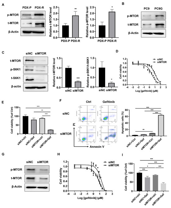 MTOR is a canonical regulator of S6K1 for protein synthesis and translation, and MTOR has been shown to be involved in EGFR-TKI resistance in various cancer types [21]. We found that both total and phosphor-MTOR were upregulated in PDX-R (Figure 3A) and PC9G (Figure 3B) cells, indicating increased MTOR activity in these cells. Knockdown of MTOR by siRNA transfection decreased total S6K1 and almost abolished phosphorylated S6K1 levels in PDX-R cells (Figure 3C). The effect of MTOR silencing on the sensitivity of gefitinib in PDX-R cells was then evaluated. The cells transfected with siMTOR showed a decreased IC50 of gefitinib compared with the control cells (10.14 µmol/L vs. 2.61 µmol/L, Figure 3D). Furthermore, with gefitinib treatment, the MTOR-silenced PDX-R cells displayed a greater decrease in cell viability (Figure 3E) and an increase in apoptosis (Figure 3F) compared to scramble-transfected control cells. We also determined the effects of MTOR knockdown in PC9G cells and found that the IC50 of gefitinib was decreased in MTOR-silenced cells compared to control cells (21.88 µmol/L vs. 6.83 µmol/L, Figure 3G,H). When exposed to gefitinib, the MTOR-silenced PC9G cells exhibited significantly decreased cell viability compared to the control cells (Figure 3I). These results suggest that the upregulation of MTOR expression and activity partially accounts for the increased S6K1 activity and gefitinib resistance in PDX-R tumors and PC9G cells.