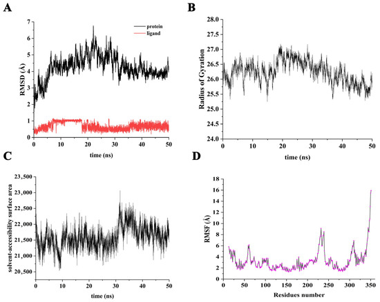 Stability during simulation period. (A) The trend of RMSD values for the molecules in the system during the simulation period; (B) the trend of PSBD1′s Rg values during the simulation period; (C) the trend of PSBD1′s SASA values during the simulation period; (D) the statistical analysis of the RMSF of each amino acid in PSBD1 during the simulation period.