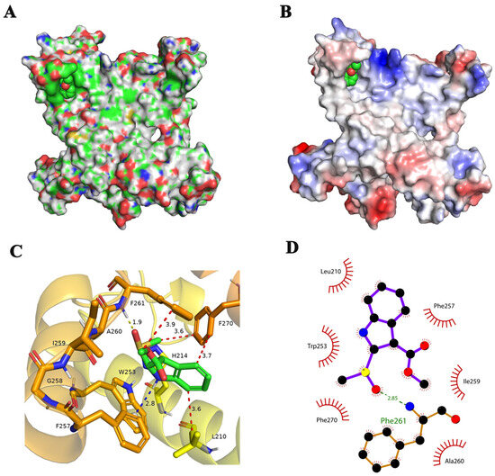 When the dynamics simulation stabilized, brassicanate A sulfoxide was primarily bound to the hydrophobic groove of PSBD1 (Figure 3A) due to the charge characteristics of brassicanate A sulfoxide itself. Brassicanate A sulfoxide was bound to the region where the electropositive and electronegative areas of PSBD1 intersect (Figure 3B). When the simulation reached an equilibrium, the specific interactions between brassicanate A sulfoxide and PSBD1 were analyzed. The analysis showed that hydrogen bonding, hydrophobic interactions, and van der Waals contacts occurred between brassicanate A sulfoxide and PSBD1. Specifically, the tertiary amine of brassicanate A sulfoxide undergoes an H-π interaction with the charge center of the side-chain phenyl ring of tryptophan, Trp-253, at a distance of 2.8 Å. The carbonyl group of brassicanate A sulfoxide forms a 1.9 Å hydrogen bond with the backbone amide bond of Phe-261. Additionally, brassicanate A sulfoxide engages in hydrophobic interactions with the surrounding hydrophobic amino acids such as Leu-210, Phe-257, Ile-259, Ala-260, and Phe-270 (Figure 3C,D).