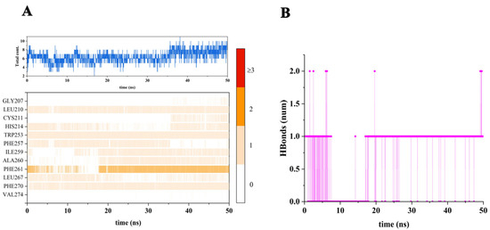 To explore the types and quantities of amino acids involved in the interaction between brassicanate A sulfoxide and PSBD1, kinetic simulations were conducted. These simulations revealed that hydrogen bonding and hydrophobic interactions are predominant between brassicanate A sulfoxide and PSBD1. Throughout the 50 ns simulation, certain amino acids consistently interacted with brassicanate A sulfoxide. For instance, Leu-210, Trp-253, and Phe-270 were continuously present, indicating persistent contact. These amino acids are hydrophobic and do not participate in hydrogen bonding, suggesting that they engage in sustained hydrophobic interactions with brassicanate A sulfoxide. The continuous orange segments which are associated with Phe-261 indicate interactions beyond hydrogen bonding and that are likely hydrophobic in nature. Ile-259 and Ala-260 also showed frequent interactions, highlighting their significance in this process (Figure 4).
