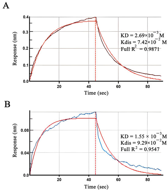 Biolayer interferometry (BLI) is an advanced, label-free, and real-time monitoring technique that facilitates the high-throughput determination of kinetic parameters during molecular interactions [12]. In BLI technology, ligands are immobilized on the surface of a biosensor, while analytes are dissolved in a solution [13]. When ligands bind or dissociate from analytes, there is a change in the thickness or density of the biolayer at the end of the biosensor. The instrument detects these changes to analyze the corresponding kinetic parameters [14]. This method can be used to validate the results of molecular docking and simulations with more convincing evidence.