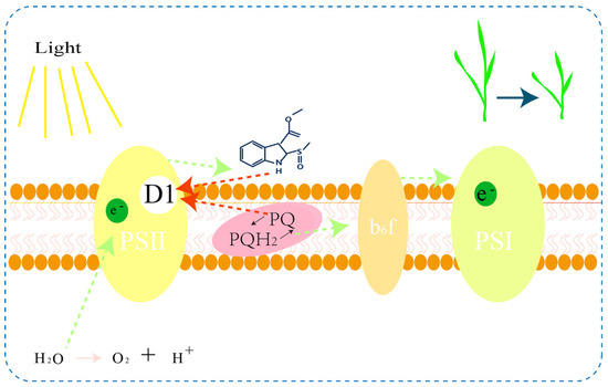 Given the significant challenges posed by existing synthetic herbicides, the ongoing search for natural herbicides as alternatives to chemical herbicides is deemed essential for long-term weed control strategies. Allelochemicals are secondary metabolites produced by different parts of plants through secretion, volatilization, and leaching, and they may affect the development of nearby plants [3,4,5]. Our research team has isolated a secondary metabolite from broccoli called brassicanate A sulfoxide, which is a sulfur-containing indole alkaloid with strong phytotoxicity against weeds and model plants [6]; however, the binding site of brassicanate A sulfoxide in plants still remains unclear.