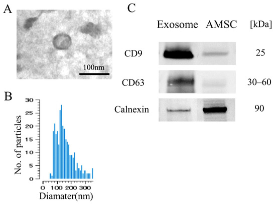 Human AMSC vials, provided by Kaneka Corporation (Osaka, Japan), were thawed and seeded at a concentration of 2.0 × 105 cells/mL in medium. The cells were incubated at 37 °C for 5 days. The medium was then replaced with serum-free cell culture medium (MEMα, 12561056, Thermo Fisher Scientific, Waltham, MA, USA) for 2 days to obtain exosome-containing medium supernatant. Differential centrifugation methods were employed for exosome isolation as previously described with minor modification [45,46]. Initially, the supernatant was subjected to a continuous centrifugation step at 2000× g for 10 min and 10,000× g for 30 min to remove dead cells and cellular debris. Subsequently, the supernatant was subjected to ultracentrifugation at 100,000× g for 70 min, resulting in the formation of a pellet consisting of small vesicles corresponding to exosomes. The size and morphology of the isolated exosomes were confirmed through TEM (H-7100, Hitachi, Tokyo, Japan) and nanoparticle tracking analysis (Videodrop, Myriade, Paris, France). Additionally, Western blotting was utilized to identify specific exosome surface markers, including CD 9 (1:500, 014-27763, Fujifilm Wako, Osaka, Japan), CD 63 (1:500, 012-27063, Fujifilm Wako, Osaka, Japan), and Calnexin (1:500, ab22595, Abcam, Cambridge, UK). Protein concentration of exosome diluted in PBS was evaluated by Pierce BCA Protein Assay kit (23227, Thermo Fisher Scientific, Waltham, MA, USA).