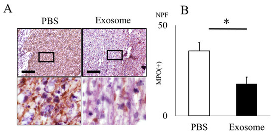 Neutrophil infiltration is inhibited by exosome administration. (A) Neutrophil infiltration in the spinal cord 4 weeks after SCI was assessed using the anti-MPO antibody. (B) The count of MPO-positive cells within the spinal cord was notably reduced in the exosome-treated group as compared to the PBS group (scale bar = 20 μm, p = 0.037). * p < 0.05.