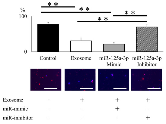 To elucidate the therapeutic mechanism of exosomes on NET formation in neutrophils, we conducted an evaluation of exosomal miRNA. Based on a literature search and confidential data provided by Kaneka Corporation, in which miRNA-125a-3p (miR-125a-3p) were abundantly expressed in the AMSC, we selected miR-125a-3p as a candidate molecule. The electroporation of the miR-125a-3p mimic and inhibitor (has-miR-125a-3p, ThermoFisher Scientific, Waltham, MA, USA) was performed according to the manufacturer’s recommendations. Neutrophils isolated from C57BL/6 mice underwent two washes with PBS without Ca2+ and Mg2+ and were then adjusted to 2 × 106 cells. After removing the supernatant, 90 μL of R buffer (Thermo Fisher Scientific, Waltham, MA, USA) was added, and the electroporation procedure was conducted using a voltage of 1720 V, a pulse width of 10 ms, and a total of 2 pulses for 20 mM of miR-125a-3p mimic and 100 mM of miR-125a-3p inhibitor. Subsequently, the cells were seeded in a 1.5 mL microtube containing 0.5 mL of pre-warmed supplemented DMEM. After 12 h, exosomes were added to the exosome group, the group electroporated with the miR-125a-3p mimic (mimic group), and the group electroporated with the miR-125a-3p inhibitor (inhibitor group). The control group was established without exosome or miR supplementation. All of the groups were then stimulated with 100 μg/mL of LPS. Following a 24-h interval, immunofluorescence staining, as previously described, was used to quantify CitH3-positive cells within the population of DAPI-positive cells.