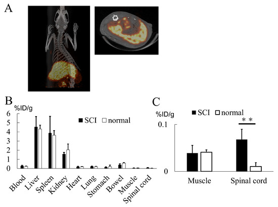 (A) 64Cu-labeled exosomes primarily localized to the liver and spleen. (B) Organ radioactivity analysis indicated substantial exosome accumulation in the liver, spleen, and kidney, with a limited presence of exosomes in the spinal cord. (C) Exosome accumulation in the spinal cord was significantly greater in the SCI model when compared to normal animals. Note that the Y-axis values in this graph are considerably smaller in comparison to those in (B) (p = 0.0234). ** p < 0.01.