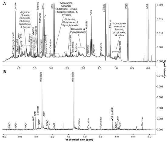 Further processing and analysis of 1D 1H NMR spectra were conducted using Chenomx NMR Suite software (version 8.4; Chenomx Inc., Edmonton, AB, Canada), as previously described [19,46]. In brief, metabolites were identified and quantified by matching characteristic chemical shifts, spectral patterns, and signal intensities to those of small-molecule reference spectra present in the Chenomx spectral database of small-molecule metabolites for 600 MHz (1H Larmor frequency) NMR spectrometers.