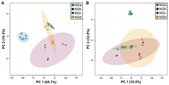 2D-PCA scores plots of M2a, M2b, M2c, and M2d MΦ subtype (A) intra- and (B) extracellular polar metabolite profiles. Shaded ellipses indicate corresponding 95% confidence intervals. Blue colored circles denote M2a MΦs; red denotes M2b MΦs; green denotes M2c MΦs; and orange denotes M2d MΦs.