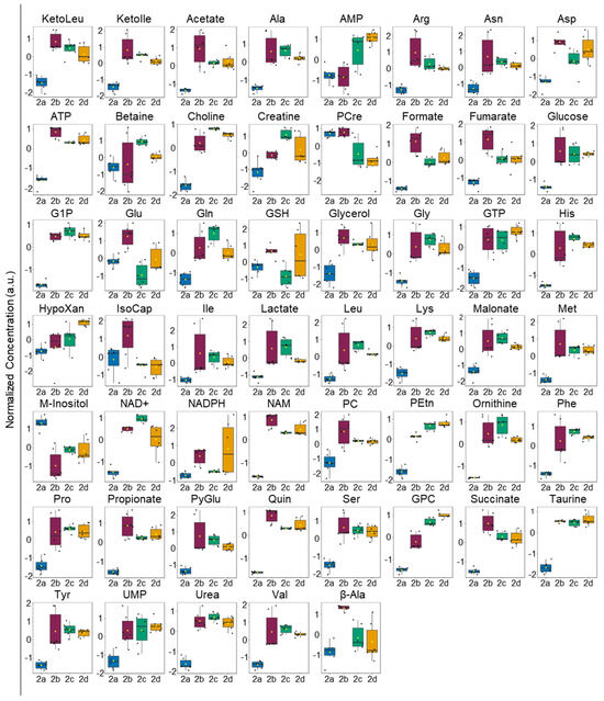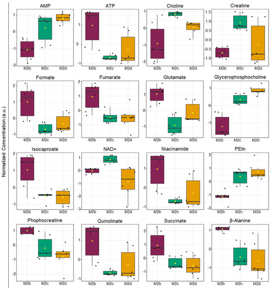 One-way parametric ANOVA analysis of intracellular metabolite levels of M2b, M2c, and M2d MΦs identified 16 significant metabolites (p < 0.05). Analysis performed using Tukey’s honestly significant difference (HSD) post-hoc analysis. The box and whisker plots display the data distribution, with each black dot representing a sample, and black lines indicating the median. First and third quartiles are represented in each filled box diagram, and whiskers extending from each quartile represent the maximum or minimum value. Abbreviations: AMP, adenosine monophosphate; ATP, adenosine triphosphate; NAD+, nicotinamide adenine dinucleotide; and PEtn, phosphatidyl ethanolamine.