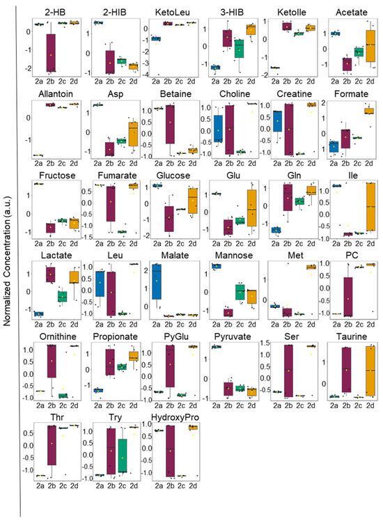 One-way parametric ANOVA analysis of extracellular metabolite levels identified 33 significant metabolites (p < 0.05). Analysis performed using Tukey’s honestly significant difference (HSD) post-hoc analysis. The box and whisker plots display the data distribution, with each black dot representing a sample, and black lines indicating the median. First and third quartiles are represented in each filled box diagram, and whiskers extending from each quartile represent the maximum or minimum value. Abbreviations: 2-HB, 2-hydroxybutyrate; 2-HIB, 2-hydroxyisobutyrate; KetoLeu, ketoleucine; 3-HIB, 3-hydroxyisobutyrate; KetoIle, ketoisoleucine; Asp, aspartate; Glu, glutamate; Gln, glutamine; Ile, isoleucine; Leu, leucine; Met, methionine; PC, phosphocholine; PyGlu, pyroglutamate; Ser, serine; Thr, threonine; Tyr, tyrosine; and HydroxyPro, hydroxyproline.