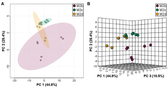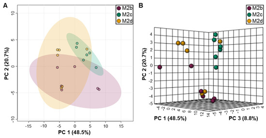 2D (A) and 3D (B) PCA scores plots generated from the extracellular polar metabolite profiles of M2 MΦ subtypes, including M2b (purple), M2c (green), and M2d (orange). In (A), shaded ellipses depict the 95% confidence intervals for the classification of the different M2 MΦ subtypes into distinct groups, based upon characteristic differences in extracellular metabolite profiles, with PC1 and PC2 accounting for 69.2% of the variance. Whereas in (B), the three principal components delineating the axes of the 3D PCA scores plot account for 78% of the variance of the PCA model, which clearly depicts the clearer separation of M2c MΦs from M2b and M2d MΦs.