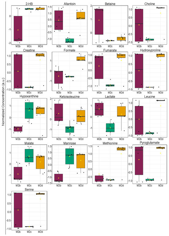 One-way parametric ANOVA analysis of extracellular metabolite levels quantified in M2b (purple), M2c (green), and M2d (orange) MΦ subtypes. This analysis identified 17 extracellular metabolites that were significant (p < 0.05) discriminators of the three M2 MΦ subtypes. The ANOVA was performed using Tukey’s HSD post-hoc analysis. Black dots represent samples, and the box and whisker plots display the median (black line in the box), first and third quartiles, range, and mean (denoted by a yellow diamond symbol in each box).