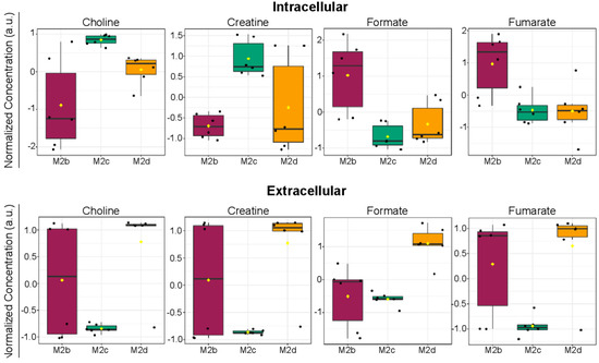 When comparing intra- and extracellular metabolites that were potentially significant discriminators of M2b, M2c, and M2d MΦ subtypes, four were found to be common to both intra- and extracellular datasets, and included choline, creatine, formate, and fumarate (Figure 9).