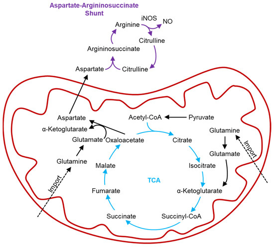 The production of nitric oxide (NO) through the coupling of the TCA cycle (blue) to the aspartate–argininosuccinate shunt (purple). HIF1α stimulates inducible nitric oxide synthesis (iNOS), promoting the conversion of arginine to citrulline and NO. The TCA cycle provides aspartate to produce argininosuccinate, thus maintaining activity of the aspartate– argininosuccinate shunt. Key steps of maintaining the aspartate– argininosuccinate shunt are the import of glutamine into the mitochondria, and its conversion to glutamate. Glutamate can then be used with oxaloacetate to produce aspartate and α-ketoglutarate, which can then be used in the TCA cycle.