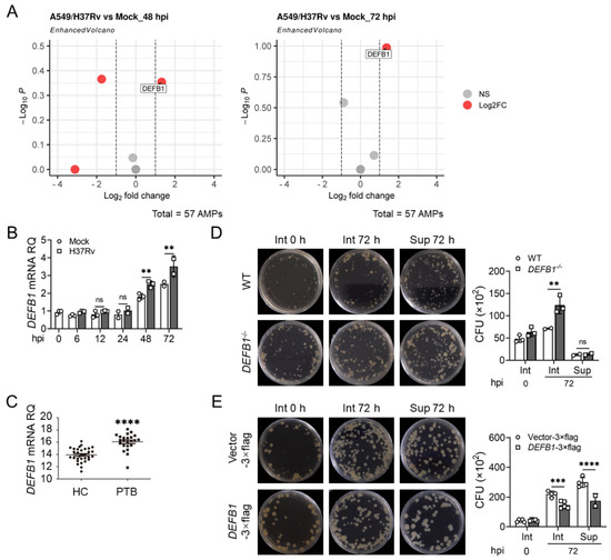 Upregulation of hBD1 in type II alveolar epithelial cells (AEC-II) efficiently suppresses the intracellular proliferation of Mycobacterium tuberculosis (Mtb). (A) Volcano plots indicating the differential expression of 57 commonly known antimicrobial peptides (AMPs) in A549 cells with or without H37Rv infection at multiplicity of infection (MOI) = 10 for 48 h (left) and 72 h (right), identified with high throughput RNA sequencing. (B) qPCR analysis of DEFB1 expression in A549 cells infected with H37Rv at MOI = 10 for 72 h. (C) qPCR analysis of DEFB1 expression in peripheral blood mononuclear cells (PBMCs) from healthy controls (HCs) and pulmonary tuberculosis patients (PTB). (D,E) colony-forming unit (CFU) assay of the intracellular (Int) and extracellular culture supernatant(Sup) bacterial load in DEFB1−/− A549 cells (D) or in DEFB1-overexpressing A549 cells (E) after being infected with H37Rv at MOI = 10 for 72 h. Data are presented as mean ± SD and are representative of at least three experiments with similar observations. ANOVA was used for comparison involving three or more variables. ** p < 0.01; *** p < 0.001; **** p < 0.0001, ns; non-significant.
