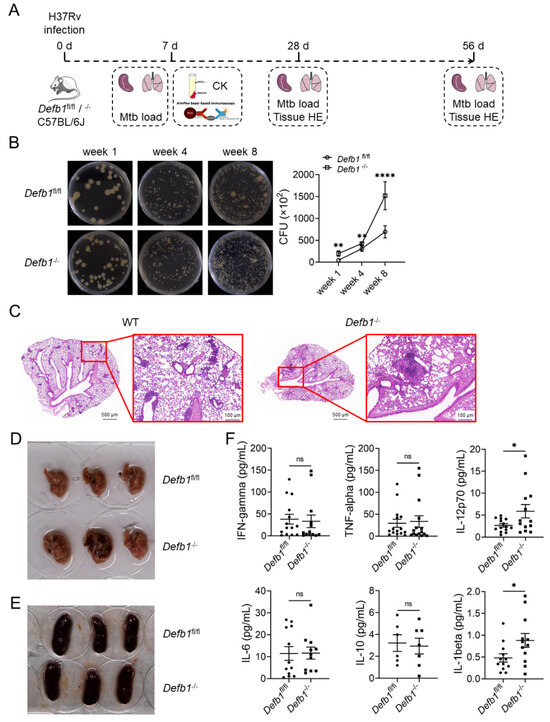 Defb1−/− mice exhibits an increased Mtb load of and exacerbates pulmonary inflammation. (A,B) CFU assay of the bacterial load in the lung of Defb1−/− mice at 1-, 4- and 8- weeks post H37Rv infection. (C,D) Histological examination with Hematoxylin and eosin (H&E) staining (C) and photographic observation (D) of the lung in WT (Defbfl/fl) and Defb1−/− mice at 8 weeks post H37Rv infection. (E) Photographic observation of the spleen in WT (Defbfl/fl) and Defb1−/− mice at 4 weeks post H37Rv infection. (F) Luminex assays of serum cytokines in WT and Defb1−/− mice at 1 week post H37Rv infection. Data are presented as mean ± SD and are representative of at least three experiments with similar observations. ANOVA was used for comparison involving three or more variables. * p < 0.05; ** p < 0.01; **** p < 0.0001, ns; non-significant.