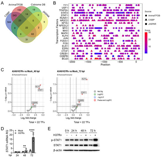 Prediction of transcription factors regulating hBD1 expression. (A,B) Venn analysis of transcription factors regulating hBD1 expression predicted with databases including CISBP, AnimalTFDB, Cisreome DB, and JASPAR (A) Their predicted binding sites on the DEFB1 gene promoter were displayed as heatmaps using the ggplot2 package in R (Version 4.2.3), following extraction and normalization of the prediction scores (B). (C) Volcano plots indicating the differential expression of the predicted 22 transcription factors in A549 cells with or without H37Rv infection at MOI = 10 for 48 h (left) and 72 h (right) identified with high-throughput RNA sequencing. (D,E) qPCR (D) and Western blot (E) analysis of STAT1 expression in A549 cells infected with H37Rv at MOI = 5 for 72 h. Data are presented as mean ± SD and are representative of at least three experiments with similar observations. ANOVA was used for comparison involving three or more variables. ** p < 0.01; **** p < 0.0001.