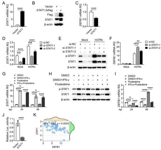 STAT1 downregulates DEFB1 expression in AEC-II cells. (A–C) qPCR and Western blot analysis of STAT1 (A,B) and DEFB1 (C) expression in A549 cells overexpressing STAT1 for 48 h. (D–F). qPCR and Western blot analysis of STAT1 (D,E) and DEFB1 (F) expression in STAT1-silenced A549 cells after infection with H37Rv at MOI = 10 for 72 h. (G–I) qPCR and Western blot analysis of STAT1 (G,H) and DEFB1 (I) expression in A549 cells treated with IFN-γ, Fludarabine or both. (J) Luciferase reporter assays of transcriptional regulation of the DEFB1 promoter by STAT1. (K) Analysis of relativity of DEFB1 and STAT1 expression in the GSE114911 [31] dataset. Data are presented as mean ± SD and are representative of at least three experiments with similar observations. Simple t-tests and ANOVA were used for comparisons involving two and three or more variables, respectively. ** p < 0.01; *** p < 0.001; **** p < 0.0001, ns; non-significant.