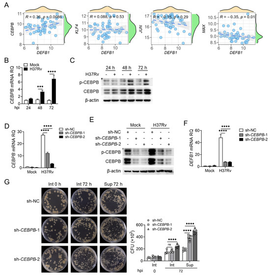 CEBPB functions to promote DEFB1 expression and suppresses Mtb growth. (A) Analysis of relativity of DEFB1 and CEBPB, KLF4, JUN, and MAX expression in the GSE114911 [31] dataset. (B,C) qPCR (B) and Western blot (C) analysis of CEBPB expression in A549 cells infected with H37Rv at MOI = 10 for 72 h. (D–F) A549 cells were silenced for CEBPB using lentivirus infection, and qPCR and Western blot analysis of CEBPB (D,E) and DEFB1 (F) expression in A549 cells with CEBPB knockdown and H37Rv infection at MOI = 10 for 72 h. (G) CFU assay of the bacterial amounts in and out of A549 cells with CEBPB knockdown and H37Rv infection at MOI = 10 for 72 h. Data are presented as mean ± SD and are representative of at least three experiments with similar observations. Simple t-tests and ANOVA were used for comparisons involving two and three or more variables, respectively. *** p < 0.001; **** p < 0.0001, ns; non-significant.